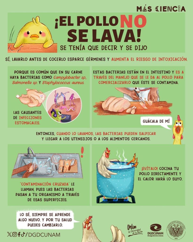 El problema no es nuevo. De acuerdo con la Dirección General de Divulgación de la Ciencia de la UNAM, lavar el pollo crudo no lo desinfecta; en cambio, puede dispersar bacterias en el fregadero, utensilios, trapos, tablas de picar e incluso en alimentos que no serán cocinados. Esta propagación invisible se conoce como contaminación cruzada.